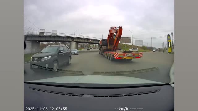Dashcam footage shows the lowboy trailer navigating a busy road when the excavator became lodged under the structure with its boom arm pressed against the ceiling, in Oryol, Russia. 2025-11-19 21:28:00