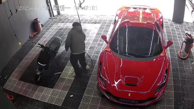 A motorist was cleaning his black two-wheeler when it suddenly took off and spun towards the red luxury sports car in Zhejiang, China. 2025-11-19 21:30:12