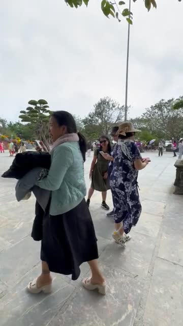 Nadine Gwen's mother visited a temple grounds with family donning a dark floral print wrap dress when she found the group with matching outfit in Da Nang. 2025-03-10 14:10:00