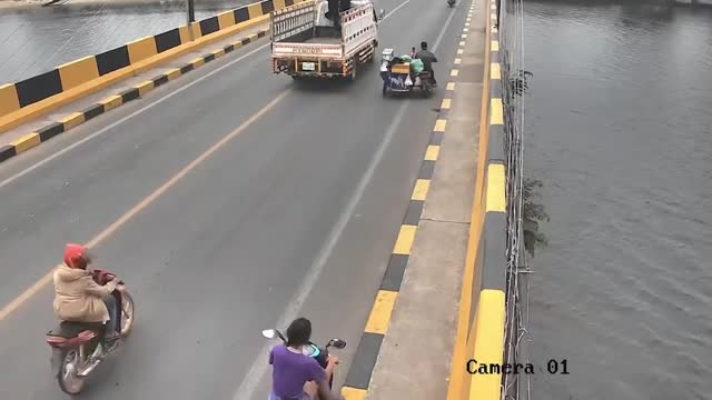 CCTV footage shows the scruffy tourist in a purple shirt and denim shorts riding a rented motorcycle across the Prek Kampong Bay Bridge in Kampot Cambodia, on March 6. 2025-03-10 13:07:43
