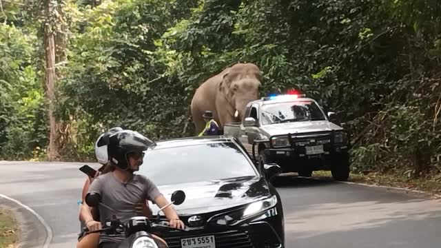 Curious elephant blocks road in Thailand