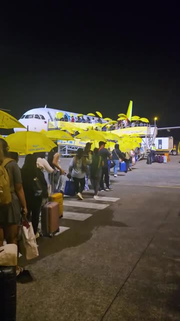 Travellers heading to Palawan queued to enter the aircraft, each holding an umbrella provided by the airline at Bacolod–Silay International Airport in Negros Occidental, the Philippines, on March 26. 2025-04-08 14:01:51