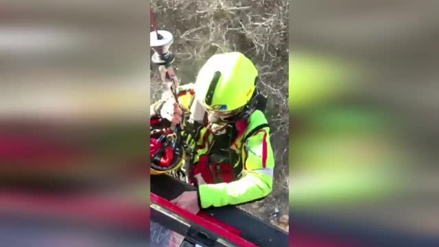 Susan River Fire Protection District and CalFire sprang into action after receiving a frantic 911 call about the hapless canine teetering on a deadly ledge 20 ft below in Lassen County on February 22.