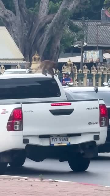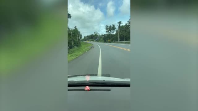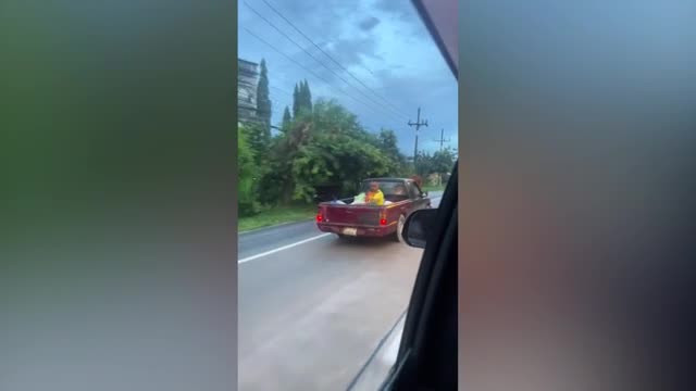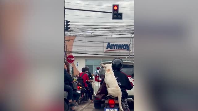 A woman passing by spotted the white canine aboard the moving vehicle along with its owner on a busy road in Nan, Thailand, on July 1. 2025-04-05 12:47:47