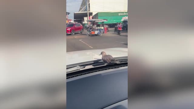 Footage shows the bird taking the front seat behind the windscreen as the father drove home with his children in Bangkok, Thailand, on May 29. 2025-04-05 12:47:04
