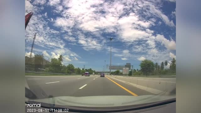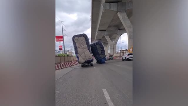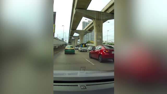 Dashcam footage shows the overloaded pickup truck trying to switch lanes but flipping over on the way in Chonburi province, Thailand, on August 11. 2025-04-05 12:47:20