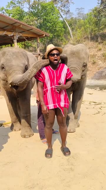 The holidaymaker burst into laughter as the two playful majestic creatures gently stroked him in Chiang Mai, Thailand, on March 24. 2025-04-05 11:53:53