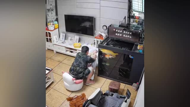 Footage shows the dad laying his baby down next to the large fish enclosure to rest in their home in Shangqiu, Henan Province, central China, on January 5. 2025-04-05 10:43:24