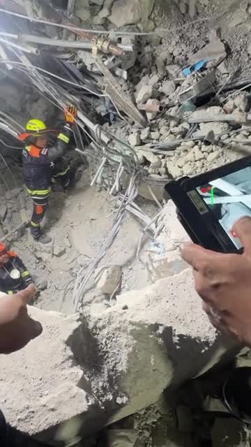 Footage shows the construction equipment collapsing as tremors rocked the building in the Chatuchak district of the capital, where a 33-storey high state office and apartment block was toppled. 2025-04-05 09:08:46