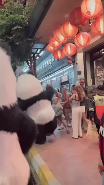 The youngster passed by the black and white mascots wearing uniform suits while walking with his family in the Chinatown area of Bangkok, Thailand. 2025-02-28 13:35:51