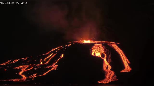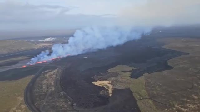 Aerial footage shows hot molten rocks seeping from the 2,297 ft (700 m) long crack, breaching the protective barrier north of Grindavik on April 1. 2025-04-03 11:48:31
