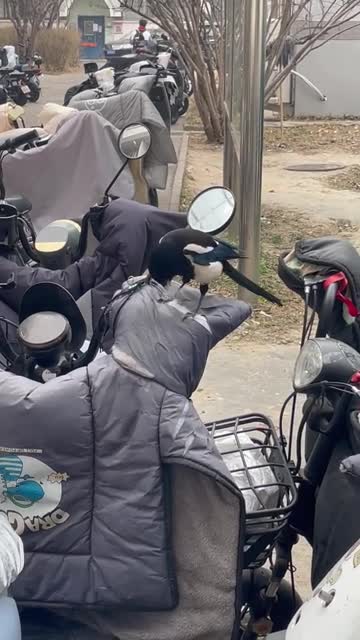 Pair of magpies tear cotton from cover of electric scooter