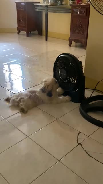 Pet dog cools off in front of fan on hot day