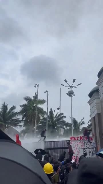 Activists allegedly burned tyres, threw firecrackers, and attempted to dismantle the parliament complex's fence before police deployed water cannons to disperse the crowd in Jakarta on March 27.
