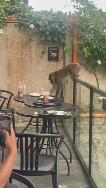 The primate climbed into the veranda of the popular coffee chain before taking some of the food on the table in Tagaytay, the Philippines. 2025-03-22 13:09:25