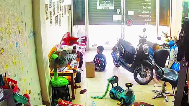 The toddler was wandering around the parked two-wheeler when he grabbed the handlebar, attempting to step on the footrest in Kamphaeng Phet, Thailand 2025-03-22 13:11:32