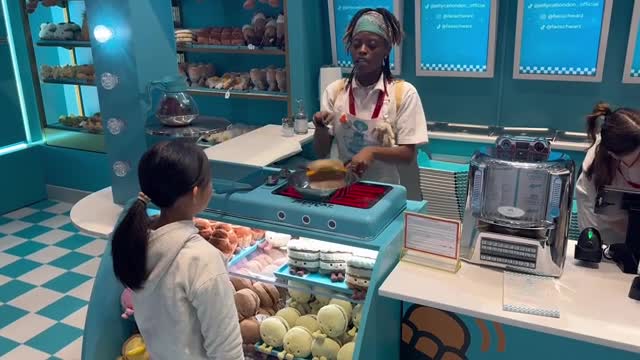 The energetic employee, wearing an apron, 'cooked' a burger plushie for a young customer at FAO Schwarz in Rockefeller Centre on March 7. 2025-03-15 14:20:30