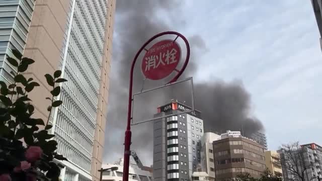 Footage shows flames engulfing the building, with thick black smoke billowing into the air in Iidabashi, Chiyoda, on the afternoon of March 27. 2025-03-27 19:04:42