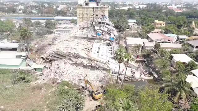 Footage shows the wreckage of apartment buildings as firefighters carried out rescue work in the Mandalay region near the quake epicentre on March 31. 2025-04-01 17:42:31