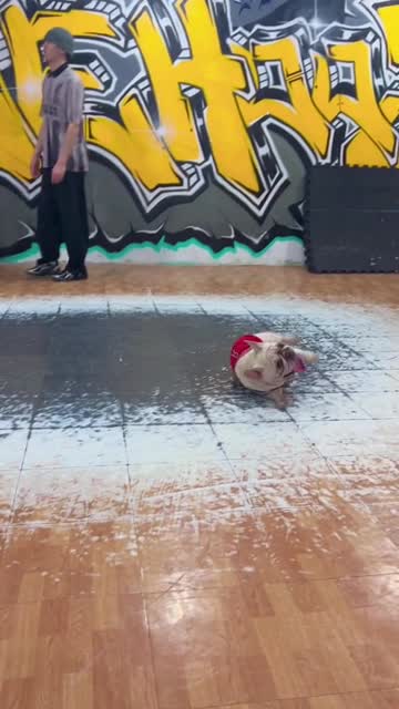 Cai Bao, the five-year-old talented pooch, wearing a red basketball jersey, wiggled on the ground, mimicking street dancers in Taipei, Taiwan, on March 25. 2025-04-01 20:40:46