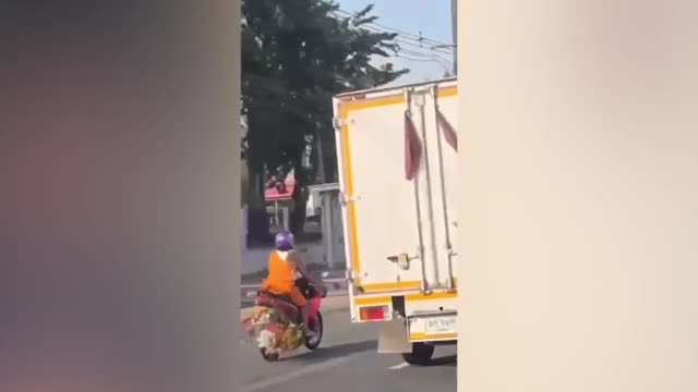 Footage shows the tiny moggy cowering on a narrow concrete lane barrier as the Good Samaritan Kritsada Pangdee crossed to save it in Bangkok, Thailand. 2025-03-20 22:43:53