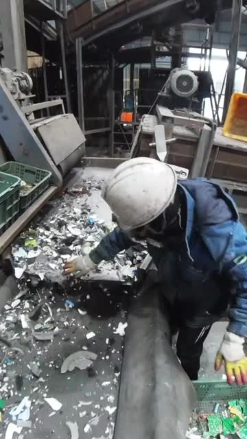 Footage shows the employee Gemar Cerna wearing thick gloves, a jacket, a hard hat, and a gas mask, quickly sorting e-waste on a conveyor belt at the facility. 2025-03-20 14:29:17