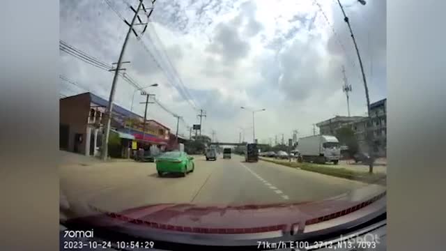 AomAmm Montraporn was driving on a busy road when a red lorry manoeuvred onto the opposite side of the traffic path, causing her to crash into the central barrier in Nakhon Pathom, Thailand. 2025-03-18 19:10:00