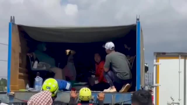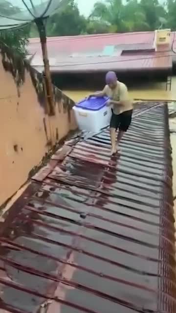 Footage shows a villager carefully balancing across a slippery roof as he carries a plastic storage box containing the child in Central Tapanuli Regency, North Sumatra Province, on November 26. 2025-11-28 14:04:52
