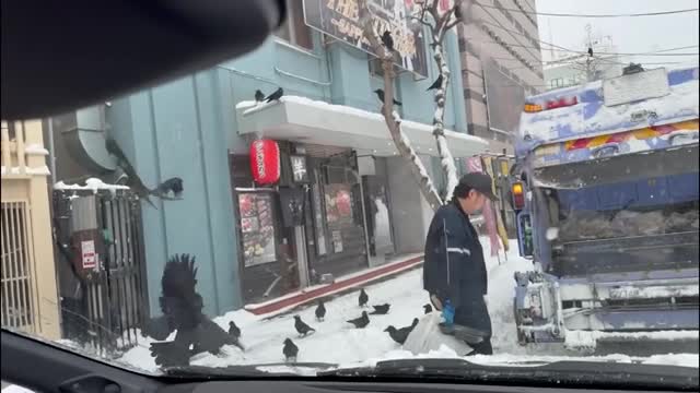 Dashcam footage shows the refuse collector carrying bags of rubbish to his truck while dozens of black birds surround him on Susukino Street in Hokkaido, Japan. 2025-12-17 15:57:39