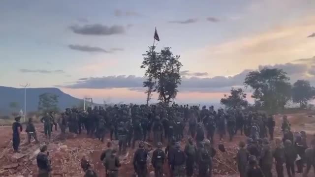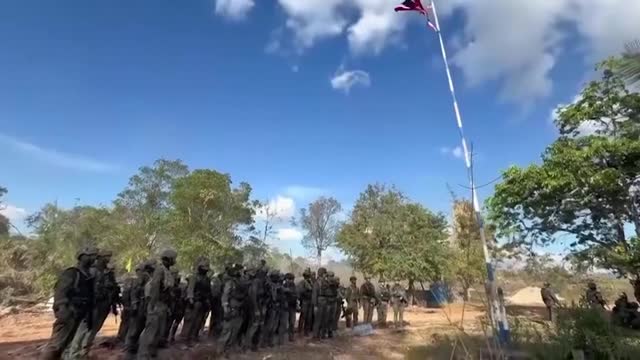 Footage shows ecstatic troops cheering and shouting as they planted the national symbol at Prasat Ta Kwai temple in Surin province on December 17, following fierce skirmishes in the area. 2025-12-18 12:16:20