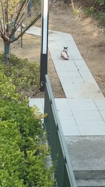 A pedestrian was strolling through a park when he spotted the black-and-white feline with its jaws clamped firmly onto the oversized, gutted fish in Jiangsu, China. 2026-01-08 13:35:33