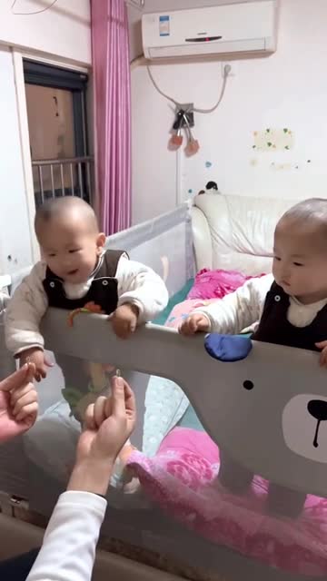 Adorable footage shows the two toddlers, dressed in white sweaters and brown jumpsuits, standing side by side in their crib in Henan, China. 2026-01-19 21:39:30