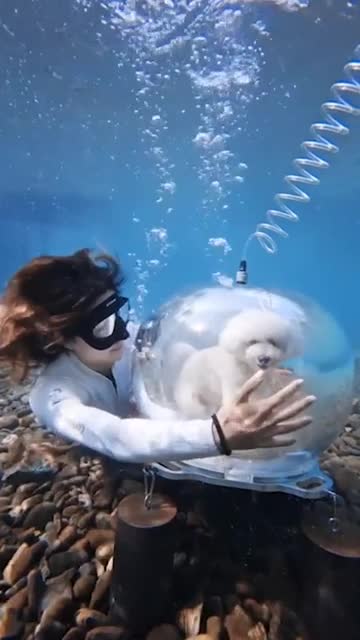 Footage shows the Bichon Frise sitting safely inside the transparent diving capsule while its owner, dressed in a white scuba suit, remains close by in Guangxi, China. 2026-01-19 21:38:27