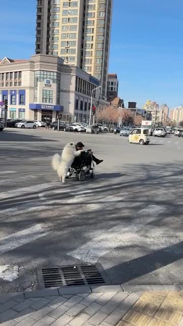 A passerby spotted the white pooch standing on its hind legs and leaning against the back of the pensioner's mobility chair in Tianjin, China. 2026-01-19 21:35:39