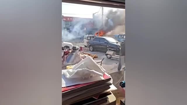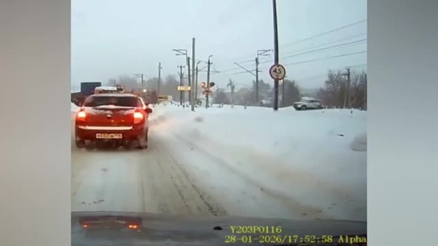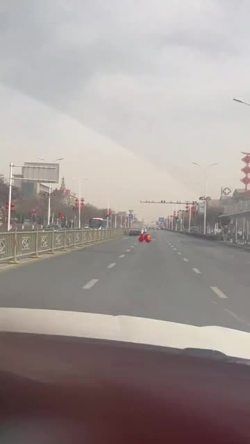 Dashcam footage shows the orange, box-style electric vehicle juddering towards a zebra crossing, while the public bus waits behind to manoeuvre a right turn in Shandong, China. 2026-02-10 20:51:23
