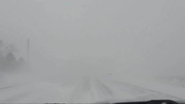 Dashcam footage captured by Rod Donavon shows strong winds driving snow across a motorway, making travel extremely hazardous south of Ames. 2026-03-17 11:53:05