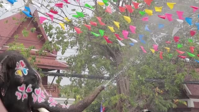 The jumbos decorated with body paint were brought out to spray water on visitors to the ancient capital, Ayutthaya, 50 miles north of Bangkok. 2026-03-17 09:35:13