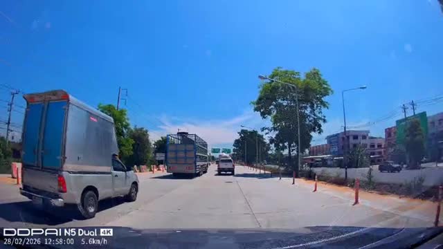 The driver and his partner were manoeuvring along the busy motorway behind the container lorry when the female baby swine slipped through a gap in the metal barriers and plunged onto the asphalt in Suphanburi, Thailand. 2026-03-24 14:28:23
