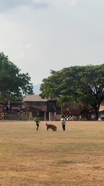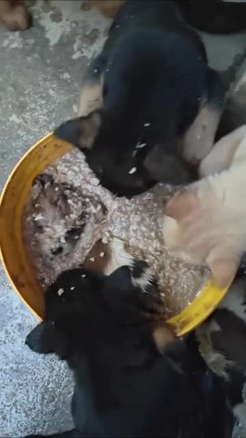 The animal lover was watching his dogs eating from the yellow container when he noticed the brown-and-white pup enjoying the meal a little too much inside the pail in Guangdong, China. 2026-03-24 14:23:13