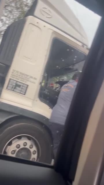 Footage shows the driver, wearing a black top and cap, sharing his seat with his partner, who appears to be wedged between him and the steering wheel while the vehicle continues along the highway. 2026-04-23 13:30:04