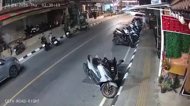 CCTV footage shows strong winds ripping off the roll-down shutter of Krua Khun Phoo Thai food outlet in Chiang Rai, northern Thailand, on April 19. 2026-04-23 14:03:19