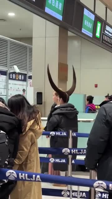 Footage shows the flier with two large spikes protruding from her head while queueing behind the check-in counter with a friend at Harbin Taiping International Airport in Heilongjiang, China, on January 18. 2025-01-22 12:21:39