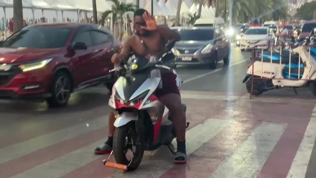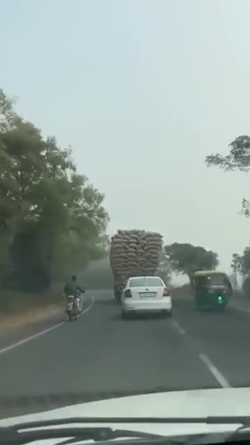 Footage shows the overloaded vehicle on the road when several bags of groundnuts suddenly tumbled off as it manoeuvred on the Jamnagar Highway, Gujarat, on December 22.