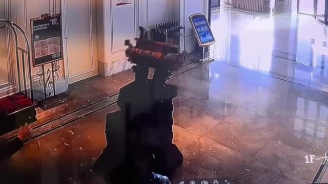 One of the staff members pushed a bucket of water across the lobby when it rolled and nudged a platform that tipped off a display in Shandong on December 5. 2024-12-16 14:36:08