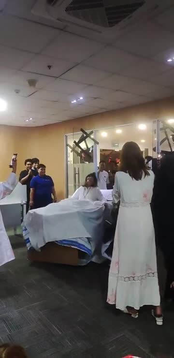 Footage captured by Jennifer Ortega shows Heidi, one of her co-workers, dressed up as a possessed woman lying on a bed during their company's Halloween party at One Corporate Centre in Manila, the Philippines. 2026-01-30 14:13:03
