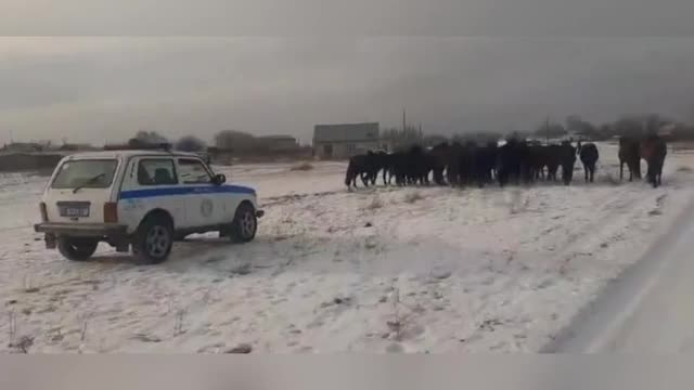 Footage shows cop vehicles sounding their sirens to guide the equines into a fenced area in Zhanasemey District, Abai region on December 6. 2024-12-09 15:14:35