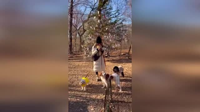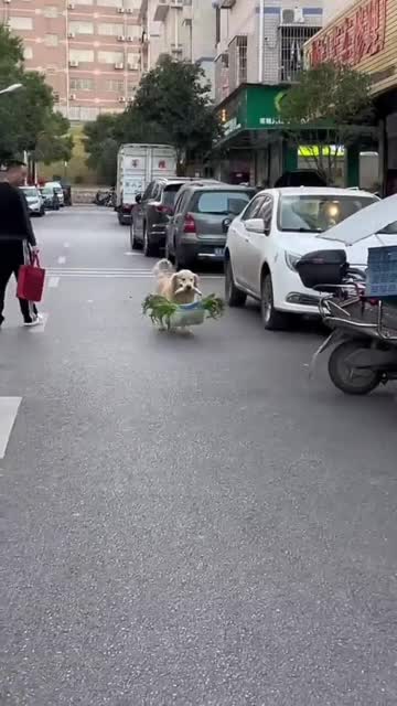 The hardworking Golden Retriever was spotted by passersby trotting down the street, holding a basket of green vegetables in its mouth in Changsha, Hunan, on November 27.