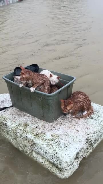 Footage captured by Pattaramon shows the felines in a plastic container and a piece of styrofoam floating in floodwaters in Ban Tha Klong, Pa Ching Subdistrict, Chana District, Songkhla Province on November 28.