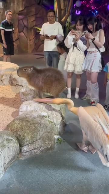 Footage shows the large bird trying to bite the water pig in their open enclosure at Wuhan Polar Haichang Ocean Park in Hubei, China on June 15.