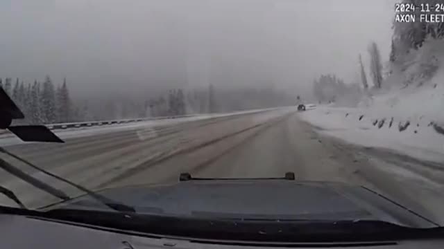 The black vehicle loses traction on slick roads in King County, swirling uncontrollably before skidding and crashing its front end into the left side of the roadway on November 24.